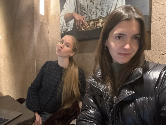 Two young adult females are depicted in a close-up selfie taken indoors, likely within a cafe or restaurant in Madrid, Spain. The subject on the right, with long dark brown hair, wears a dark green turtleneck under a black glossy puffer jacket and gazes directly at the camera. The subject on the left, with long blonde hair in a ponytail, wears a dark patterned jacket, pouts her lips, and looks towards the camera. A silver-colored laptop is partially visible on a dark, stone-like table in the lower-left foreground. Behind them, a heavily textured, light brown wall is visible, illuminated by warm, dim lighting. A large framed artwork hangs prominently, showing a person's upper body and hands holding a bowl of food. A dark red/burgundy fur-like textile is draped over a seating area on the left.