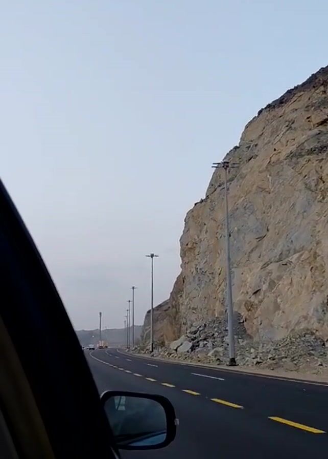 view from inside a car driving on a road. A large rock face rises sharply on the right side of the road, with a series of tall light poles lining the roadway along the rock face. The road has two lanes, separated by double yellow lines. There are some cars visible in the distance. The sky is overcast and gray.
