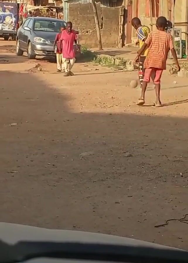 several children playing soccer in a dirt road in front of houses and parked cars. A person is recording from inside a car, looking out the windshield. The focus and zoom changes during the video.
