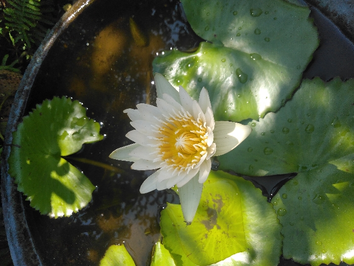 A white water lily with a bright yellow central cluster floats prominently in the lower-middle of the frame, its white petals partially open. Multiple green lily pads, some with visible water droplets, surround the flower on a dark body of water. This aquatic arrangement is contained within a circular, dark-colored, rough-textured ceramic pot, the rim of which is discernible along the upper and right edges of the image. Natural sunlight illuminates the scene, creating strong highlights on the flower petals, water droplets, and parts of the lily pads, while casting shadows on the water and other leaves. Faint, out-of-focus dark green foliage is visible in the upper-right background beyond the pot's rim. No individuals, explicit actions, or interactions are depicted. This scene is located in the city of Siquisique, Venezuela.