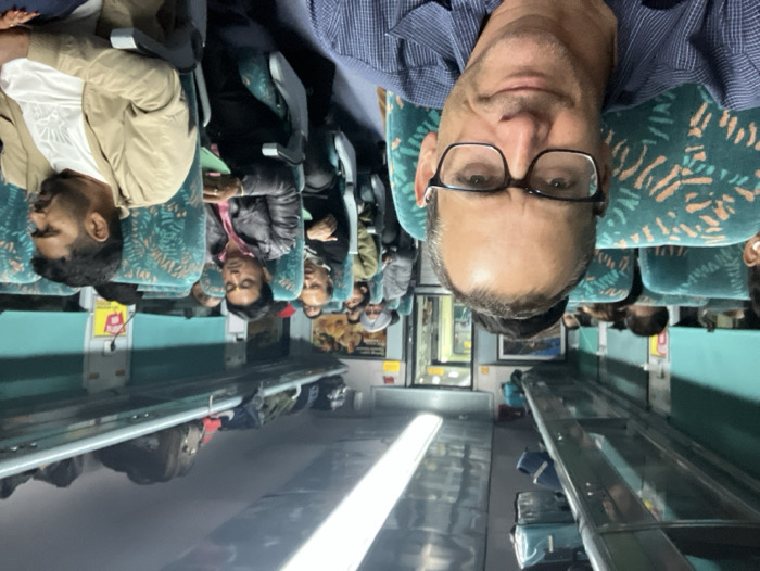 The scene is set inside a passenger train carriage, characteristic of the Indian railway system, in Delhi, India. In the immediate foreground, a middle-aged male with short, greying hair and black-rimmed eyeglasses is taking a selfie, looking directly into the camera with a slight smile. He is wearing a blue collared shirt with a subtle pattern. He occupies a patterned teal and beige train seat. To the right of the primary subject, in the midground, a male passenger with a beard, wearing a light tan jacket over a white t-shirt, is seated, looking towards the right side of the carriage. Behind him, another male passenger in a dark leather jacket over a pink shirt is looking downwards. Further down the aisle, several other male passengers are visible, seated, some looking forward, others obscured. The train interior features rows of teal and beige patterned seats. Overhead, light-colored luggage racks contain several backpacks and duffel bags. Fluorescent tube lighting illuminates the carriage from the ceiling. Turquoise-colored window shades or panels are visible along the left side of the carriage. A poster or advertisement is present on the far left wall, and a red symbol is affixed to the wall on the right side. Through an open doorway at the far end of the carriage, additional passengers and the interior of an adjoining section are visible. The overall environment is that of an occupied passenger train during transit.