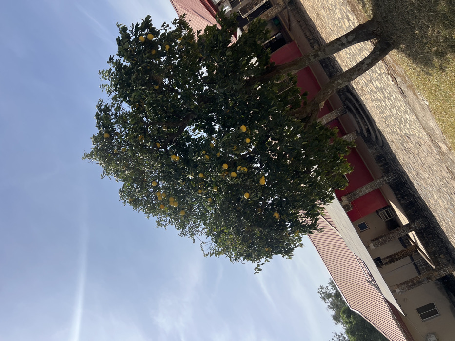 The image presents an outdoor scene in Jos, Nigeria, featuring a prominent, fruit-laden tree against a bright blue sky. A large, multi-trunked tree, covered in dense green foliage, occupies the central and right portions of the frame. Numerous round, yellow-orange fruits, consistent with citrus, are visible among its leaves. The sky is predominantly clear blue, with a discernible sunflare originating from the upper left quadrant, indicating bright sunlight. In the mid-ground, to the left of the tree, stands a single-story building with a reddish-brown corrugated metal roof sloping downwards from right to left. Below the roof, a section of a light-colored wall is visible, along with a shaded porch area supported by dark, possibly stone-clad, columns. Behind these columns, a distinct red wall section is present, bearing a mounted air conditioning unit. A window is visible on the far left of this structure. A second building, featuring a similar reddish-brown corrugated metal roof, is partially visible on the far right edge of the frame. The ground surface consists primarily of an irregular, flat stone pavement, possibly flagstone or cobblestone, displaying varied shades of gray and brown. A small patch of green grass is visible to the immediate right of the tree's base. No human figures are present in the depicted scene.