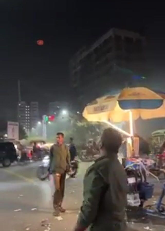 A man in a dark jacket stands on a busy city street at night, tossing a red object in the air. He then turns to face the street and walks toward the traffic. The street is littered with trash, and there are food stalls and people milling about. Cars, motorcycles, and cycle rickshaws are passing on the road. The sky is dark, and streetlights illuminate the scene.