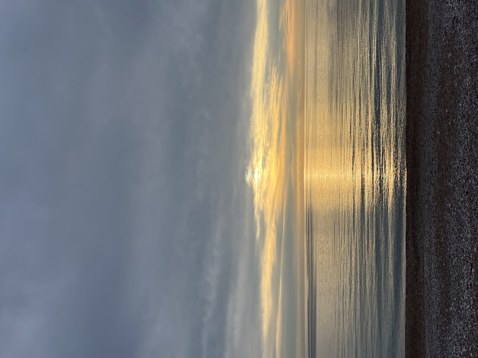 This image depicts a tranquil coastal scene at either sunrise or sunset in Sveti Stefan, Montenegro. The scene is dominated by a flat, calm body of water under a partially cloudy sky. The sky, occupying the upper two-thirds of the frame, features extensive dark grey and lighter grey stratiform clouds. A prominent horizontal band of warm yellow and orange light, indicative of the sun's position, cuts across the mid-horizon, with the brightest point of the sun discernible through a break in the clouds slightly to the left of the image's vertical center. This sunlight casts a shimmering, golden-yellow reflection directly onto the water, forming a visible path extending from the horizon towards the foreground. The water outside this reflection is a muted, dark blue-grey, showing subtle horizontal ripples. The foreground, comprising the bottom tenth of the image, consists of a pebble beach made up of small, varied stones in shades of grey, brown, and off-white. No individuals, man-made structures, or distinct actions are present in the frame.