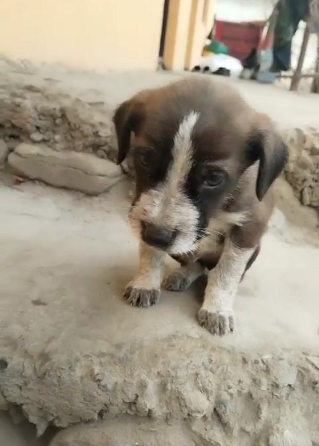 A short video shows a close-up of a small puppy sitting on a rough, concrete surface