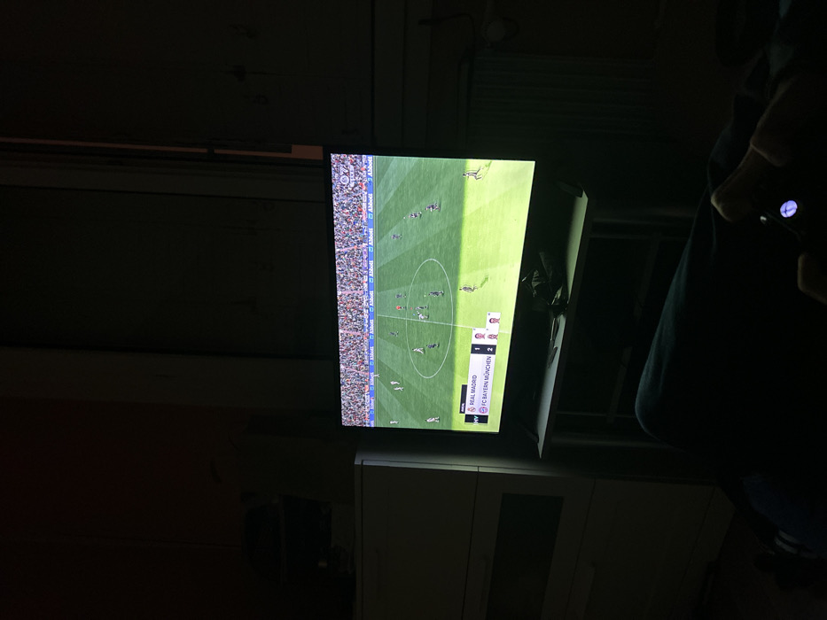 A television displays a soccer match between Real Madrid and FC Bayern München. Real Madrid is winning 2-1. The view is from an angle in a dimly lit room. A person with a phone is visible on the right side, possibly taking a picture of the TV. Cabinets are seen below the television. The wall and ceiling are visible in the background, creating a close, indoor setting.