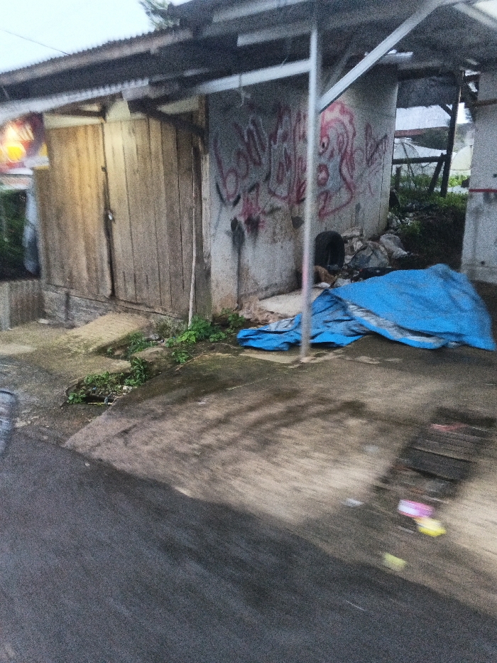 The image presents an outdoor urban scene in the city of Unknown, Uruguay. The foreground features an asphalt road surface transitioning to a concrete sidewalk or ground area that is cracked and contains scattered vegetation. To the left, a structure with a corrugated metal roof exhibits a weathered wooden facade and a partially visible yellow-orange sign. Adjoining this, a concrete wall is heavily marked with red and black graffiti tags. A silver metal support pole extends vertically in front of this wall, which has a crumpled blue tarp and a partially obscured black tire at its base. Additional debris and overgrown vegetation are visible behind the pole and wall. No individuals are present. Small pieces of colorful litter are scattered on the asphalt in the lower right quadrant.