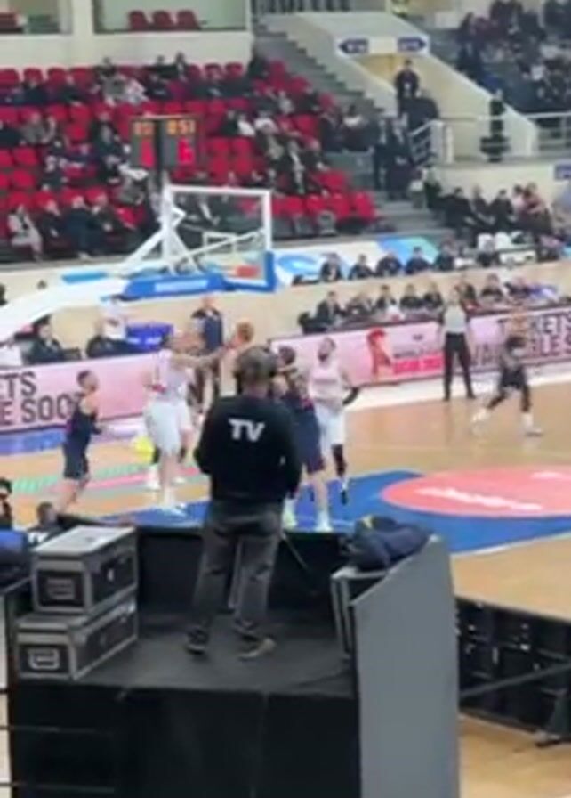 basketball game. A camera person wearing a black shirt with the word "TV" printed on the back stands on a raised platform, filming the game. Players in navy and white uniforms are in the middle of the game on a blue and white court. A referee is on the court. Fans are in the stands, clapping. There is a large screen showing the game in the background.