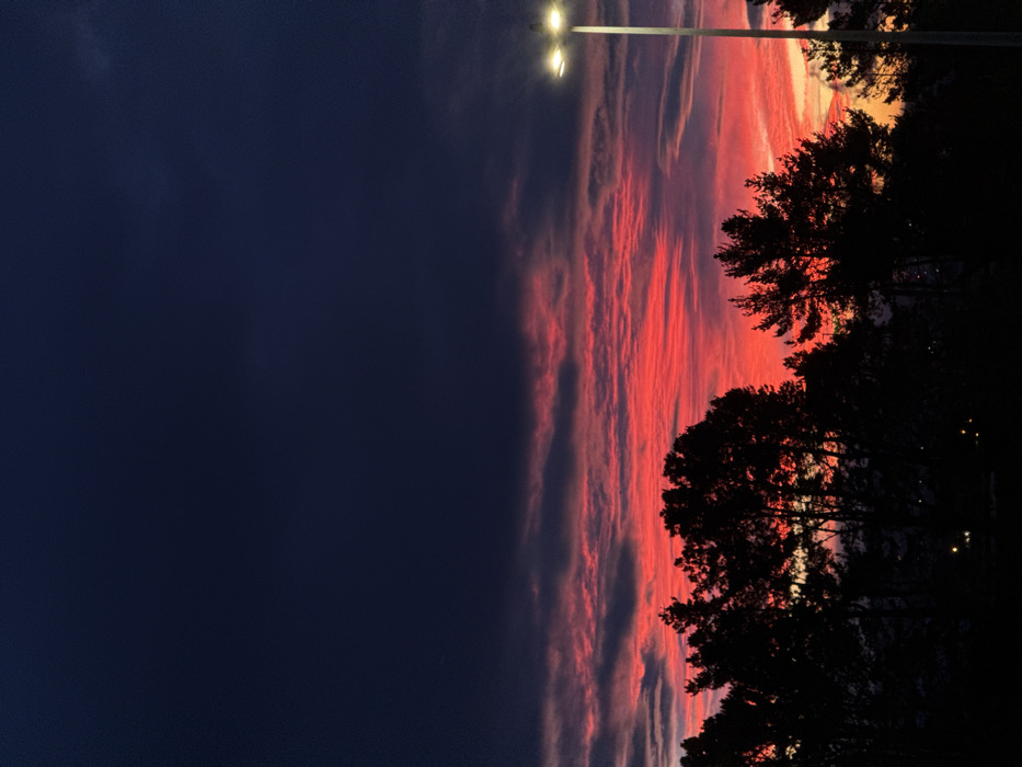 A vivid, horizontally oriented sunset image captures the twilight hour. A gradient of deep blue night sky transitions to bright red and orange clouds. A solitary light pole illuminates the scene from the upper right corner. Dark, silhouetted trees line the bottom of the frame, adding a natural contrast to the colorful sky. The scene conveys a sense of calm and the beauty of a fading day.