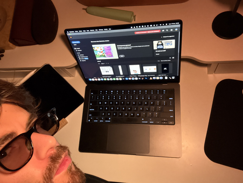 A person wearing sunglasses is in the lower left of the frame. A laptop sits open on a desk, displaying what appears to be Adobe Illustrator. A tablet rests to the left of the laptop. A desk contains a pen-shaped object on the top, and a round object, and a mousepad on the right side.