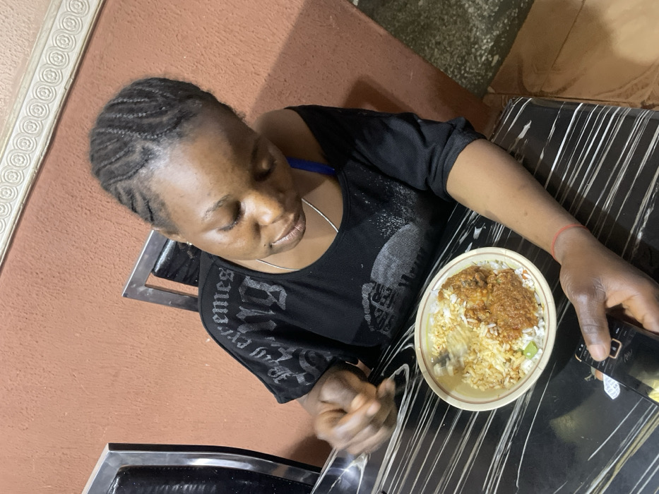 An adult female is depicted seated at a dark, patterned table in an indoor setting, asserted to be in Jos, Nigeria