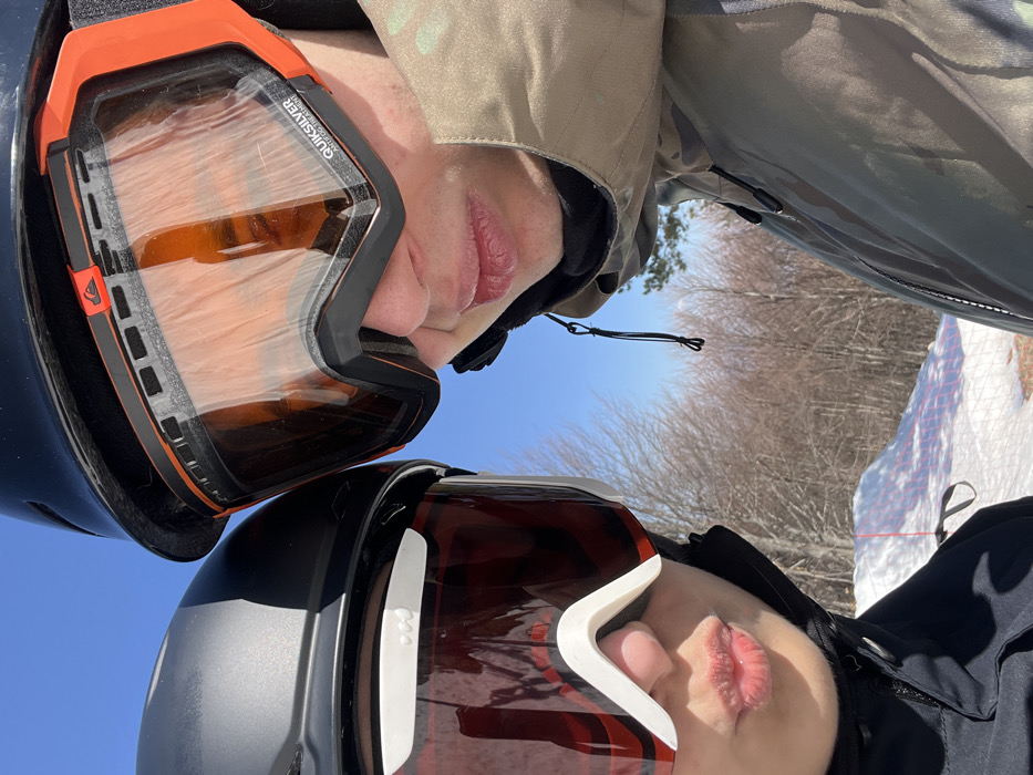 A close-up, low-angle image captures two individuals on a ski slope in Bogoslov, Bulgaria, under a clear blue sky. The person on the left wears a matte black ski helmet and dark red-tinted ski goggles with a prominent white nose bridge, their lips visibly puckered in a "kiss face." A portion of a black winter jacket is visible. The person on the right wears a black ski helmet with an orange top accent and orange-tinted Quiksilver ski goggles, their lips displaying a neutral expression. They are dressed in a camouflage-patterned winter jacket. The background reveals a snow-covered slope, a red safety net, and a line of bare deciduous trees under bright sunlight.
