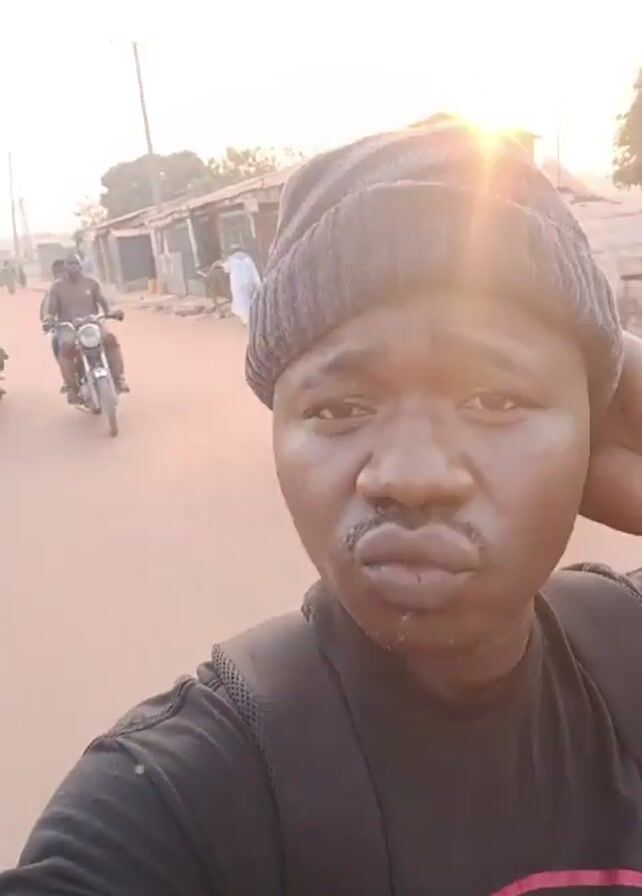A man wearing a black t-shirt and a gray beanie is taking a selfie video on a dusty street