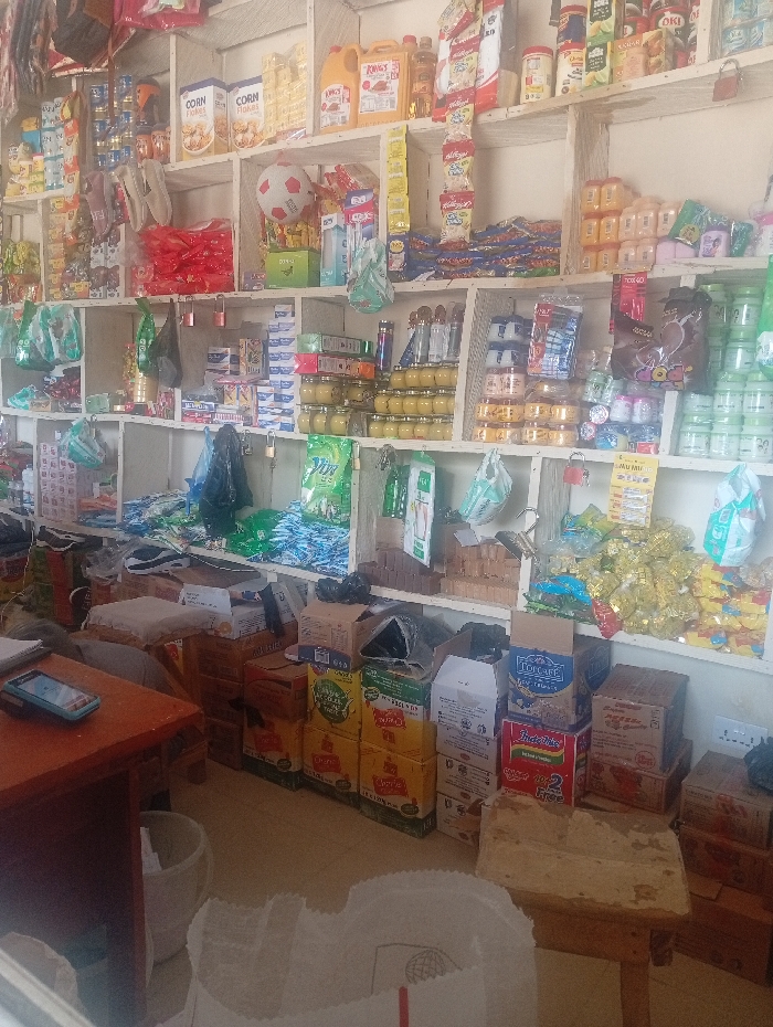 This image depicts the interior of a small, well-stocked general store or provision shop located in Sumaila, Nigeria
