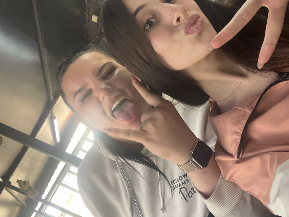 A digital image depicts two young women posing for a photograph indoors in the city of Tvarditsa, Bulgaria