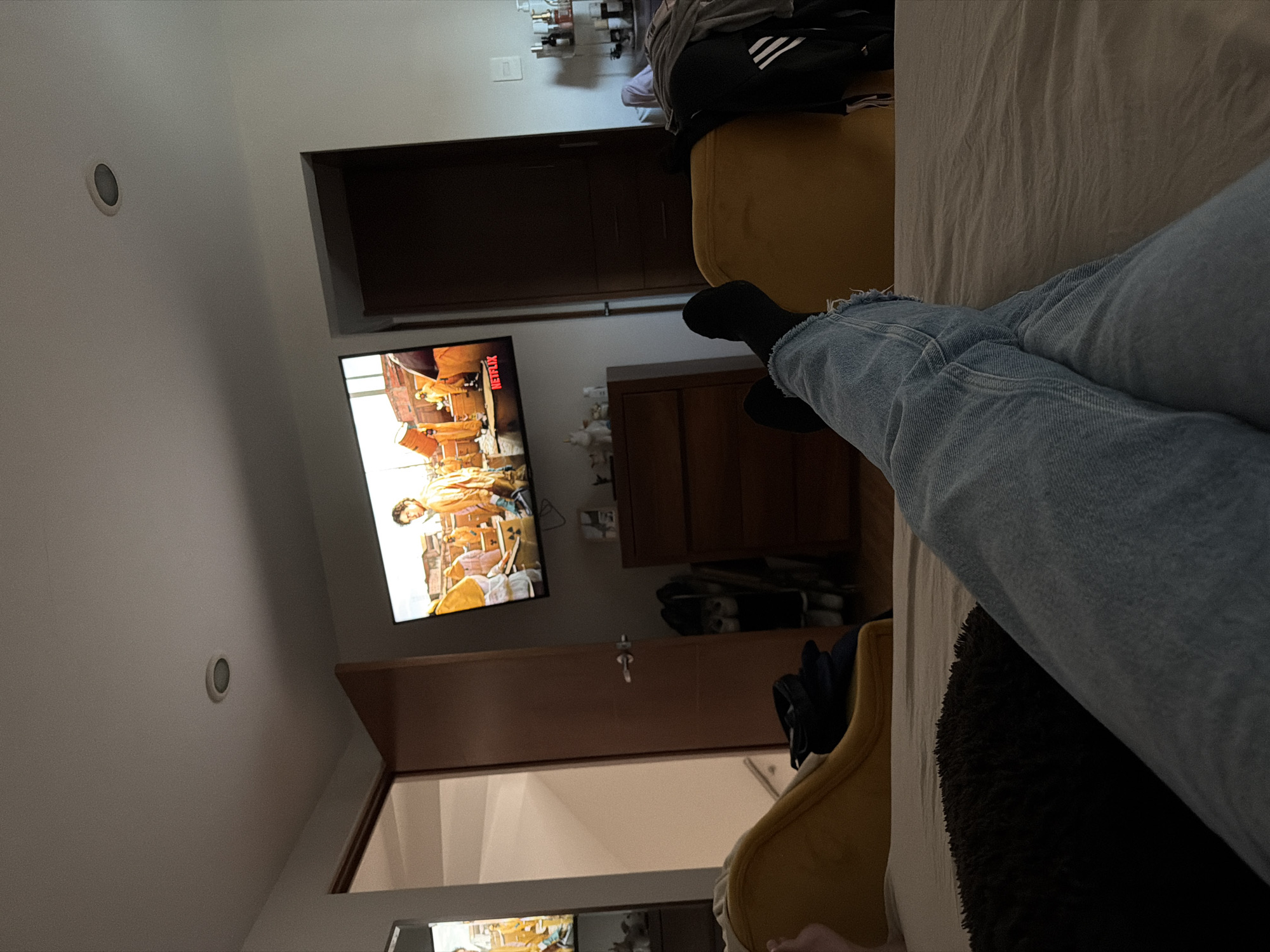 The scene depicts a domestic interior within a residence in Santa Clara Ocoyucan, Mexico. The perspective is low-angle, from a person lying on a bed. The person's lower legs are visible in the foreground, clad in light blue distressed jeans and black socks, crossed at the ankles. A dark, fluffy object rests on the bed to the person's left. In the midground, a large flat-screen television is mounted on a light-colored wall, displaying content with multiple individuals in yellow or orange protective suits; the Netflix logo is visible on the screen. Below the television, a dark brown wooden dresser or cabinet holds various small items on its surface. To the left of the television, a partially open brown wooden door leads into another room or hallway featuring a light-colored wall and a railing. A mirror is partially visible on the wall to the far left. To the right of the television, a closed brown wooden door is visible. Two yellow upholstered armchairs are positioned on either side of the foreground; the one on the right has clothing, including a black garment with white stripes, draped over it. Behind the left armchair, a shoe rack holds multiple pairs of shoes. A wall-mounted shelving unit containing bottles is visible on the far right wall. The ceiling is white and features two recessed circular light fixtures. The room is dimly illuminated.