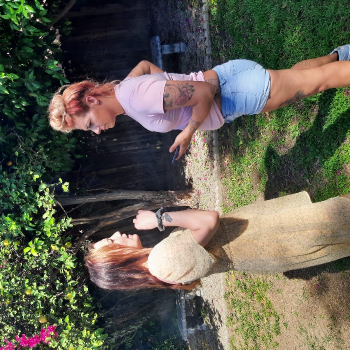 This image captures an outdoor scene within a residential backyard in the city of Los Angeles, United States of America. Two adult females are standing facing each other on a sunlit lawn, suggesting an interaction or conversation. The female on the left possesses long, brown hair with lighter highlights, worn down. She is dressed in a light-colored, patterned, short-sleeved dress. A dark gray scrunchie is visible on her left wrist, along with a dark-colored tattoo on her inner left forearm. Her left hand is clenched into a fist and held near her chin. The female on the right has reddish-blonde hair styled in an updo on top of her head. She is wearing a light pink short-sleeved t-shirt and light blue denim shorts. Her left arm displays extensive floral tattoos, with additional tattoos visible on her right arm and lower legs. She holds a dark-colored smartphone in her left hand and places her right hand on her hip. The environment includes a backdrop of dense green foliage, featuring trees bearing yellow, spherical fruits (consistent with citrus) and a plant with bright pink blossoms. A wooden fence is partially visible behind the vegetation. The ground consists of green grass interspersed with patches of dry soil or gravel. Two light-colored concrete garden benches are positioned in the mid-ground. The scene is illuminated by strong, direct sunlight, casting distinct shadows.