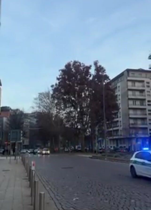 street scene in a city. The road is paved with cobblestones and has a line of bollards separating it from the sidewalk on the left side of the frame. On the right side of the road, there is a large tree with dark red leaves. In the background, there are buildings, including a tall apartment building. The sky is blue with some light clouds. Several cars and a motorcycle are on the road. A police car with its blue lights flashing drives by, with a siren wailing. A person stands on the sidewalk, looking down at their phone.