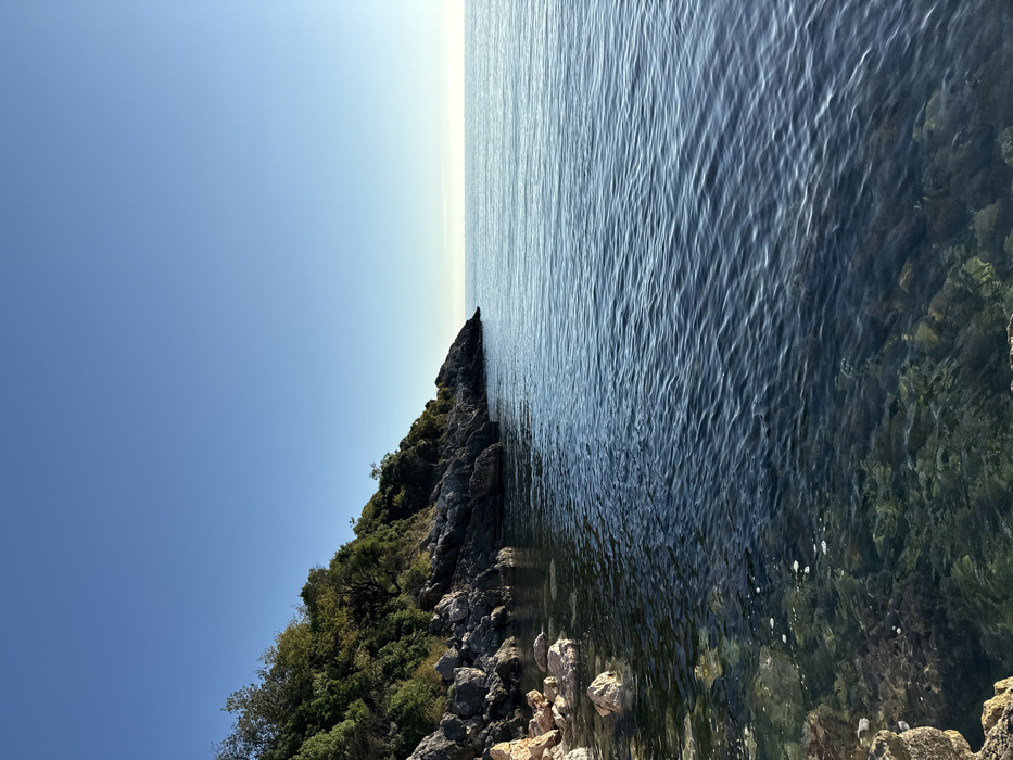 The image displays a tranquil coastal scene in Kamenovo, Montenegro. The upper half of the frame is dominated by a clear, bright blue sky. Below, the calm, dark blue-green sea extends to a distant, hazy horizon. The immediate left foreground reveals clear water with visible rocks on the seabed. A rocky promontory, covered with dense green trees and shrubs, extends into the water from the left. The shoreline consists of various sized grey and tan rocks, some fully exposed and others partially submerged in the clear water. No individuals, animals, or man-made structures are present within the frame. The environment is illuminated by natural daylight.