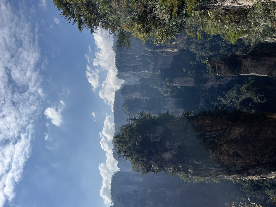 Jagged, towering rock formations covered in lush vegetation dominate the landscape, under a blue sky dotted with white clouds. The scene captures the unique and otherworldly beauty of the Zhangjiajie National Forest Park, with sunlight casting shadows and highlighting the textures of the rocks and greenery. The composition emphasizes the height and scale of the peaks, creating a sense of awe and natural wonder.