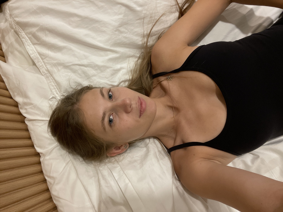 A fair-skinned young woman with light brown hair lies on a white bed. She is wearing a black tank top, and a delicate gold necklace is visible around her neck. Her face is relaxed, and she is looking directly at the camera. The bed linens are slightly wrinkled. The background features a wood-paneled wall.