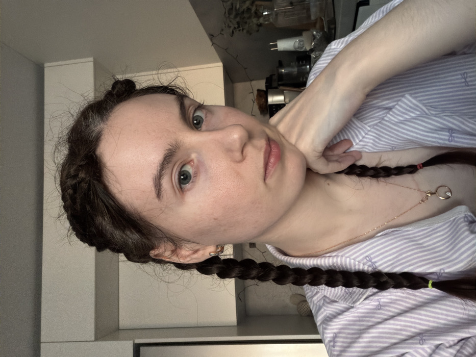 An adult Caucasian female is depicted in a close-up, head-and-shoulders portrait, positioned centrally within the frame. Her dark brown hair is arranged in multiple braids; two prominent pigtail-style braids extend over her shoulders, secured by a green elastic band on the viewer's left and a red/orange elastic band on the viewer's right. Additional braids are visible along the scalp. Fine, lighter-colored hairs, consistent with early graying, are present near the temples. Her eyes are light, and her complexion is fair with visible skin texture. She wears a light-toned, vertically striped collared shirt adorned with a repeating pattern resembling small bows. A delicate gold-colored chain necklace with a circular pendant, which includes a small, light-colored, possibly geometric inlay, is visible. A small gold-colored hoop earring is present in her left ear. Her left hand, with visible knuckles and faint lines, rests under her chin, suggesting a contemplative or relaxed pose. The subject's expression is neutral, directed forward. The background is an interior space, consistent with a domestic kitchen or living area, featuring light-colored upper cabinets. On the right side of the frame, various objects are present on a surface, including a dark-colored appliance, multiple glass containers, a plant, and a string of decorative lights. The elements within the image do not provide specific geographical indicators to identify the location as Yanino-1, Russia.