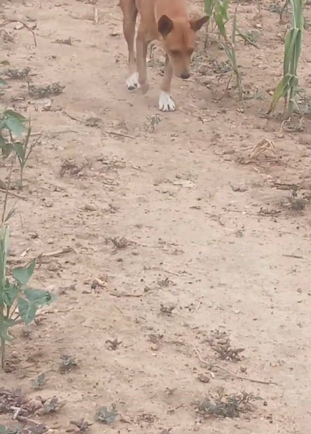 A tan, short-haired dog with white paws stands in a dirt field, looking slightly to its left. The ground is bare and dry, with scattered weeds and small plants. Some stalks of corn or similar tall grass grow along the edge of the frame. The camera is positioned above the dog, looking down.