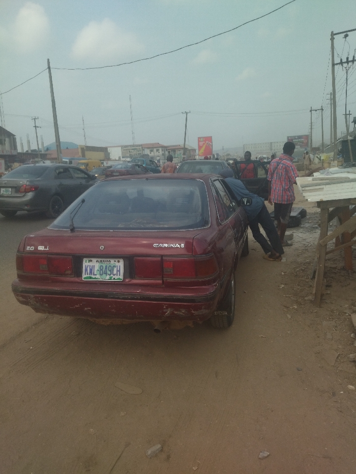 red Toyota Carina II sedan parked in a dusty street in the city of Warri, Nigeria