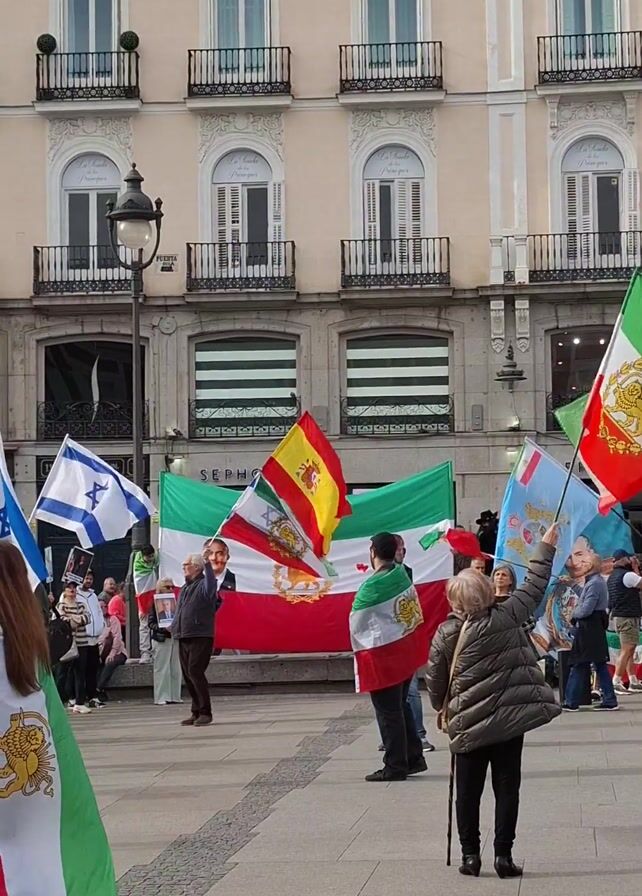 The video depicts a gathering of people in an urban plaza. The flags of Iran, Israel, and Spain are visible. Some people are holding flags. Buildings with multiple windows and balconies form the backdrop. Some businesses are visible in the background. A lamppost stands near the front of the frame. The people appear to be protesting or demonstrating. Some wear vests or jackets, and some wear glasses.