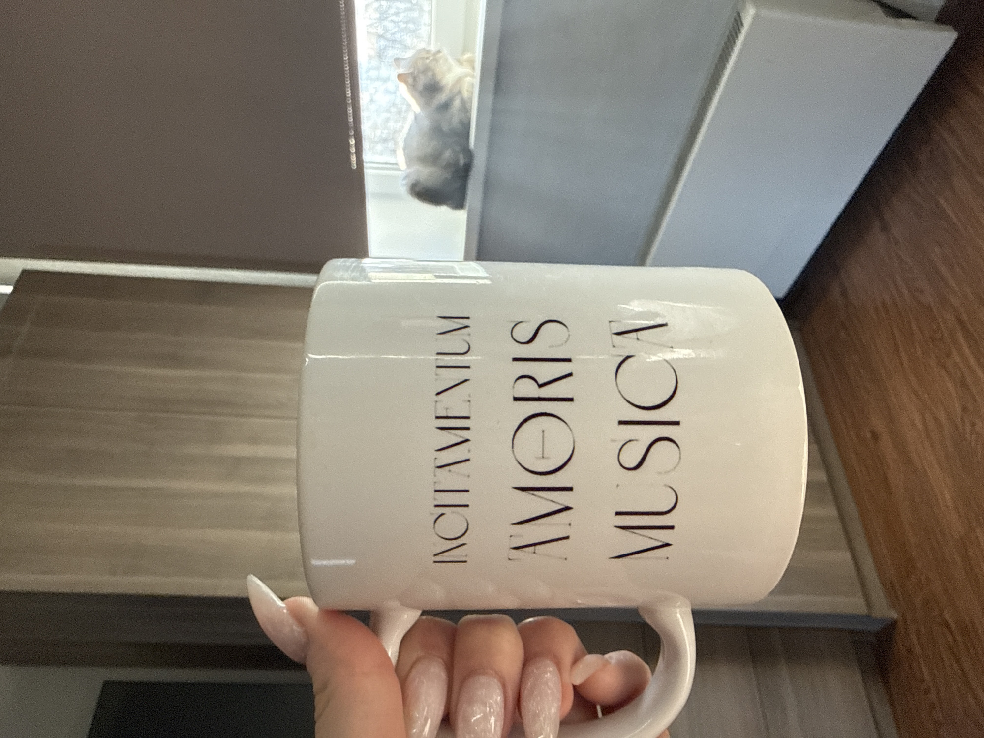 A person is holding a white mug with the words "INCITAMENTUM AMORIS MUSICA" printed vertically in dark lettering