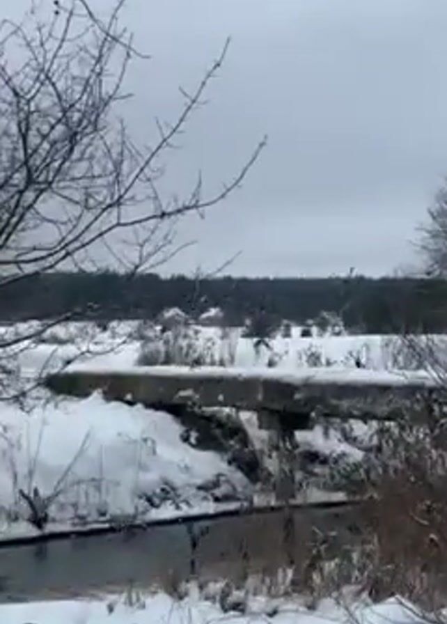 winter landscape with snow-covered ground and bare trees. A narrow stream flows under a small, concrete bridge. Initially, the view is partially obstructed by tree branches. Then a large flock of birds takes flight from the bridge area and flies away into the distance. The backdrop includes a forest and a few houses with snow-covered roofs. The sky is overcast.