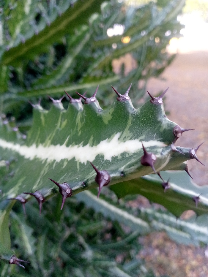 A close-up shot reveals a variegated Euphorbia trigona cactus. The plant has a distinct light green and white striped pattern. Rows of paired, sharp thorns line the edges of the cactus, each thorn appearing a dark reddish-brown color. The shot is taken at eye-level, with soft, natural lighting illuminating the scene. The background is blurred, suggesting depth of field.
