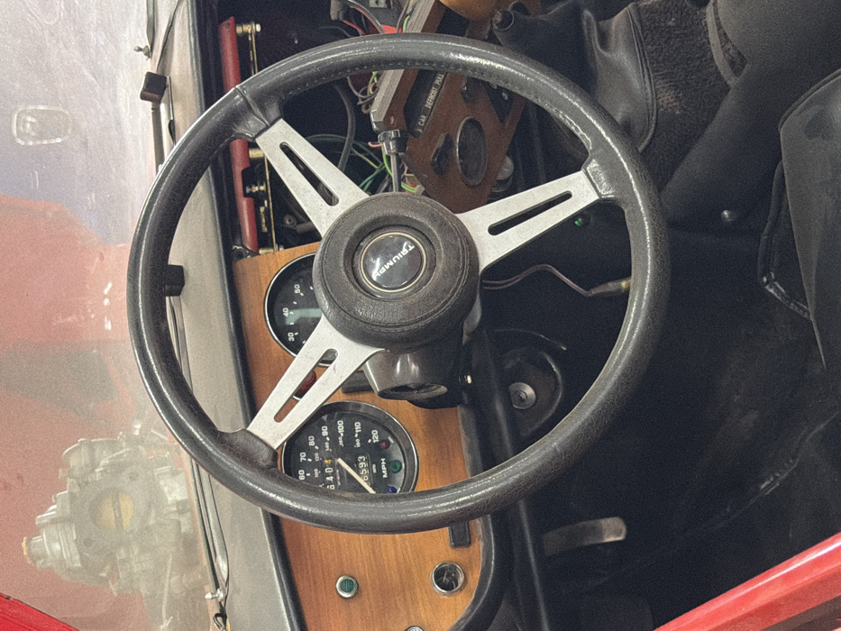 The image showcases the interior of a classic Triumph sports car. Dominating the frame is a black steering wheel with a silver Triumph emblem at its center. Behind the wheel, a wooden dashboard houses analog gauges, including a speedometer showing 6593 miles. Wires and other components are visible, suggesting possible maintenance or restoration work. The overall impression is of a vintage vehicle with a blend of style and functionality.