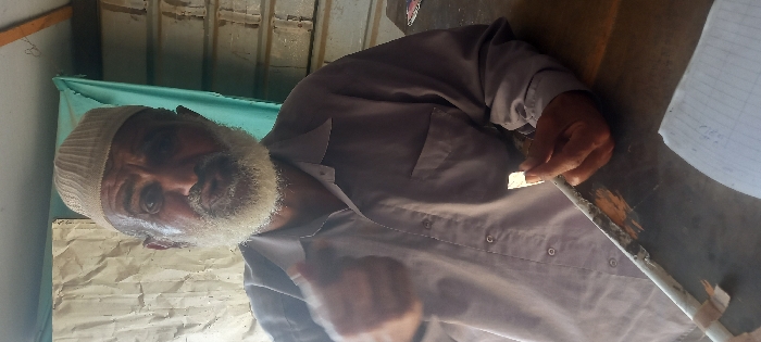 The image displays an elderly male subject, seen from the chest up, in an indoor setting within Khan Yunis, Palestinian Territory