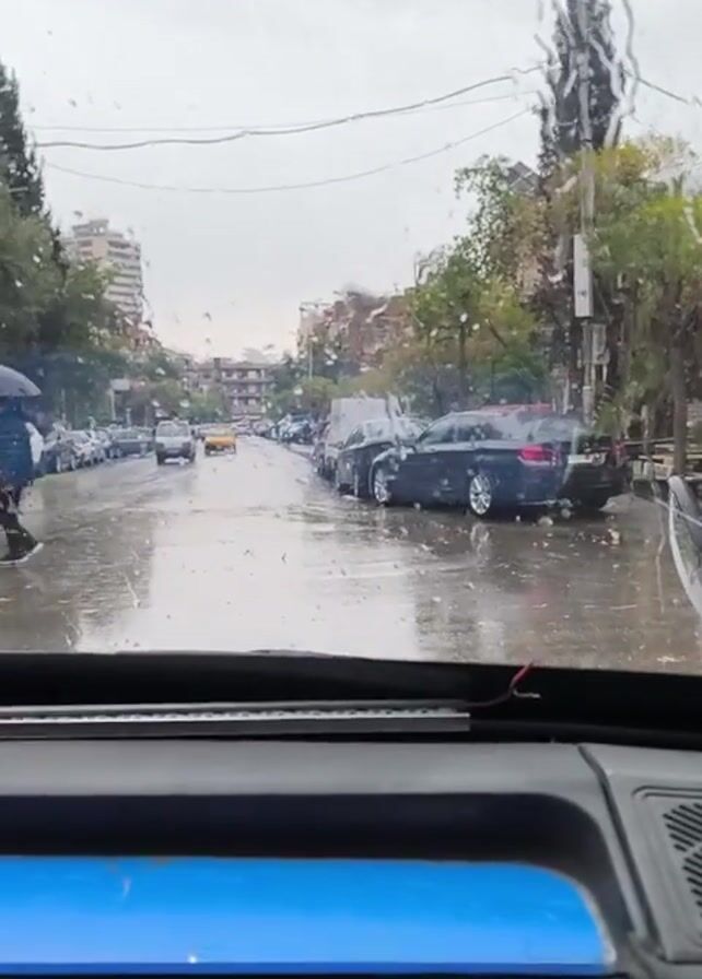 The video is taken from inside a car driving down a street during a heavy rain. The windshield is covered with raindrops. Several parked cars line the side of the street, which is flooded with water. A person with an umbrella is seen crossing the street on foot. More cars are visible in the distance. The weather appears overcast. The interior of the car shows a blue panel on the dashboard. There is a cough audible in the background.