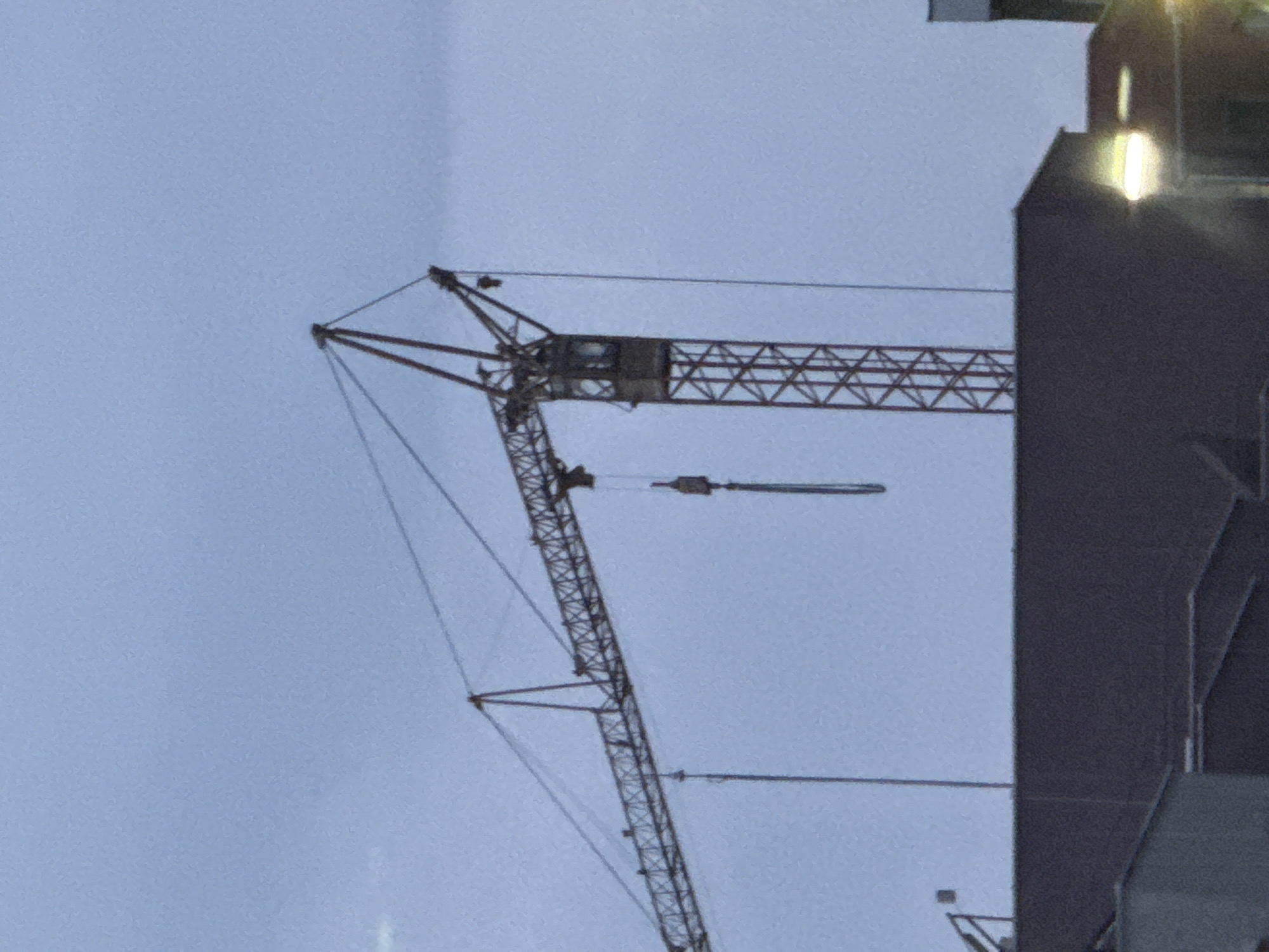 construction crane in Burgas, Bulgaria. The crane is situated next to a tall building. The sky is overcast.