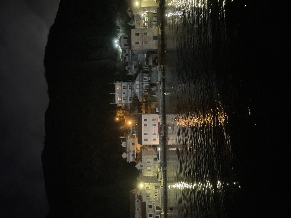 The image depicts a nighttime scene of the waterfront in Lepetane, Montenegro