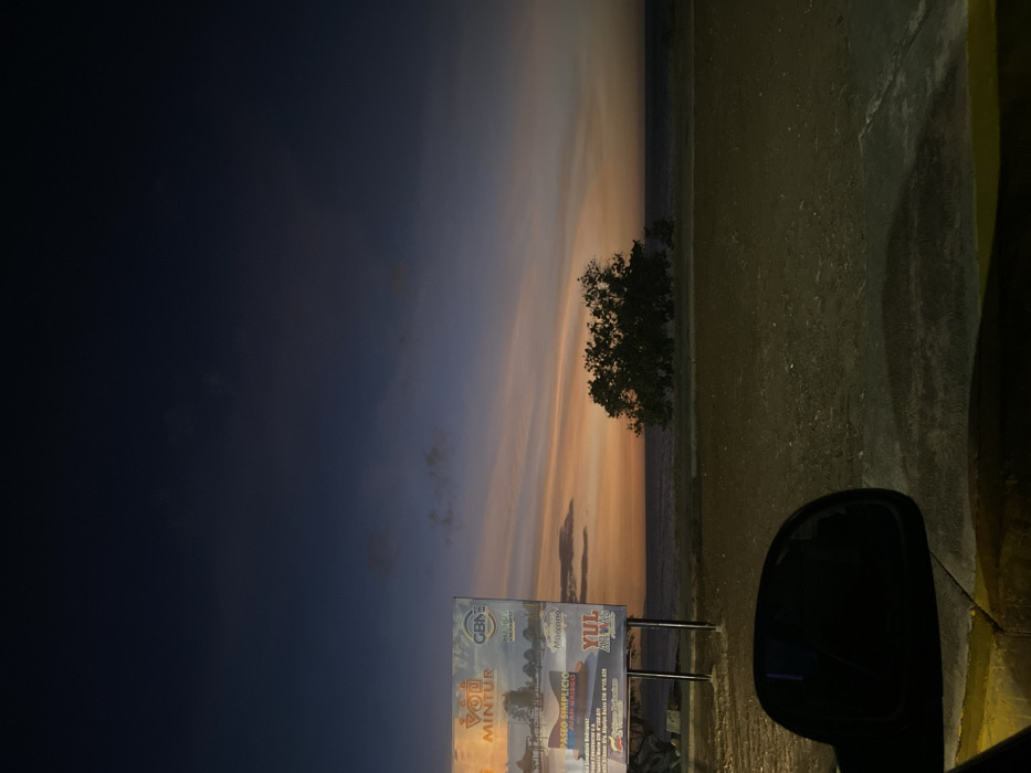 The image captures a twilight coastal scene in Juan Griego, Venezuela. The perspective is from within a vehicle, with a dark side-view mirror visible in the lower-left foreground, along with a portion of the dashboard and a yellow curb line. To the left, a large, illuminated rectangular billboard displays multiple logos and text, including "VOD MINTUR," "GBNE," and "PASEO SIMPLISIO JUAN GRIEGOS." The ground immediately in front of the vehicle is a dark, unpaved expanse. In the mid-ground, a dark body of water, presumably the sea, extends horizontally. A cluster of dark-foliaged trees stands near the water's edge on the right side. The sky dominates the upper half of the frame, exhibiting a gradient from vibrant orange and pink hues at the horizon, indicative of a sunset, transitioning to deep blues and purples overhead. Elongated clouds are visible within the colorful horizon band. No individuals or specific actions are discernible.