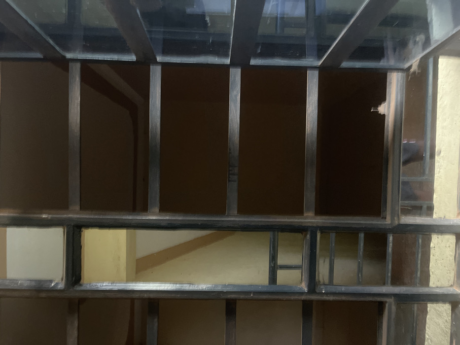 This image depicts an interior view looking out through a window with a dark metal grid framework. The window is composed of multiple rectangular panes, some containing glass reflecting interior elements, while others offer a view to the outside. On the left side, visible through a vertical series of panes, is a narrow section of an exterior or adjacent building wall, painted a light cream or yellow color, featuring a diagonal light brown stripe. The right side of the view through the window is predominantly dark, showing horizontal metal bars, suggesting a sheltered or less illuminated area. In the lower-center-right, a small, distant, white structure with a pointed top is faintly visible through a pane. A reflection of what appears to be a person's lower legs and dark trousers is visible in the bottom-center glass pane. The scene is located in Gitothua ward, Kenya.