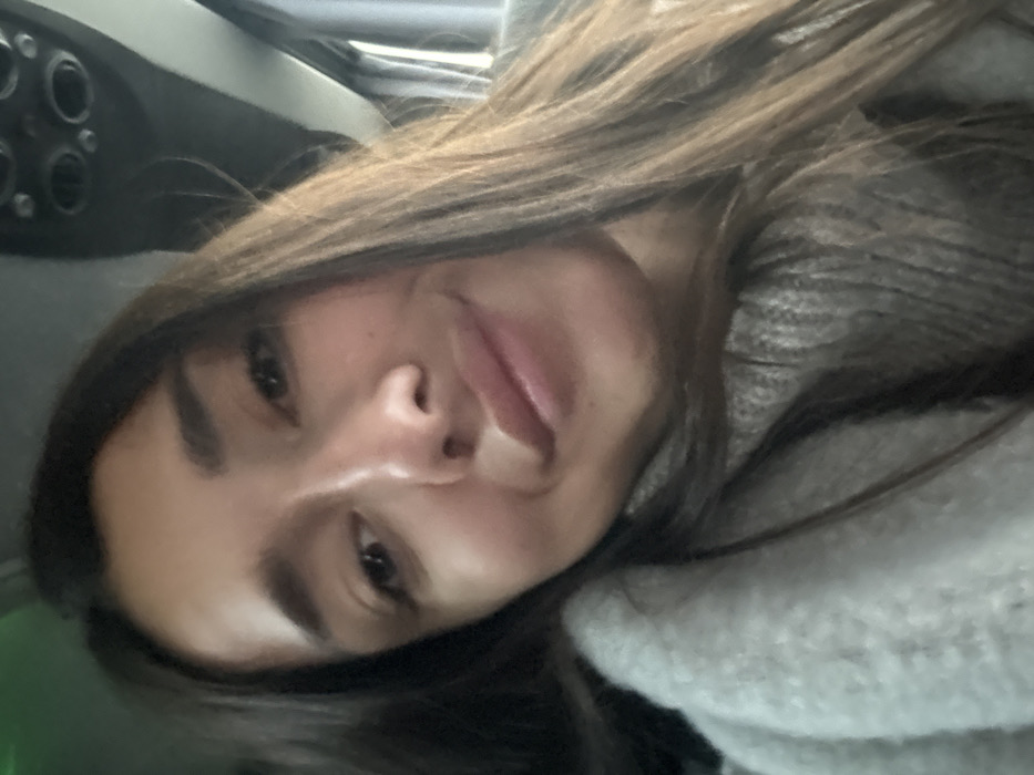 A selfie depicts a woman with long, dark hair. Her face is prominent, angled slightly downward, and lit with a soft glow. She has dark eyes, prominent cheekbones, and full lips. The background reveals a portion of a car interior, including the dashboard. She is wearing a light gray garment. The photo has a slightly blurry, casual feel.