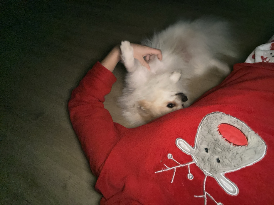 A high-angle image captures a person interacting with a dog in an indistinguishable indoor setting; the specific location in Barcelos, Portugal, cannot be determined from visual evidence. A person's upper torso and right arm, clad in a red long-sleeved top featuring a grey reindeer with a red nose, occupy the left side of the frame. The person's right hand gently touches the belly of a small, fluffy white dog, possibly a Pomeranian, which is lying on its back with its head partially visible, facing the viewer. A white fabric with a red and white pattern is visible in the bottom right corner. The background consists of a dark, uniform surface.