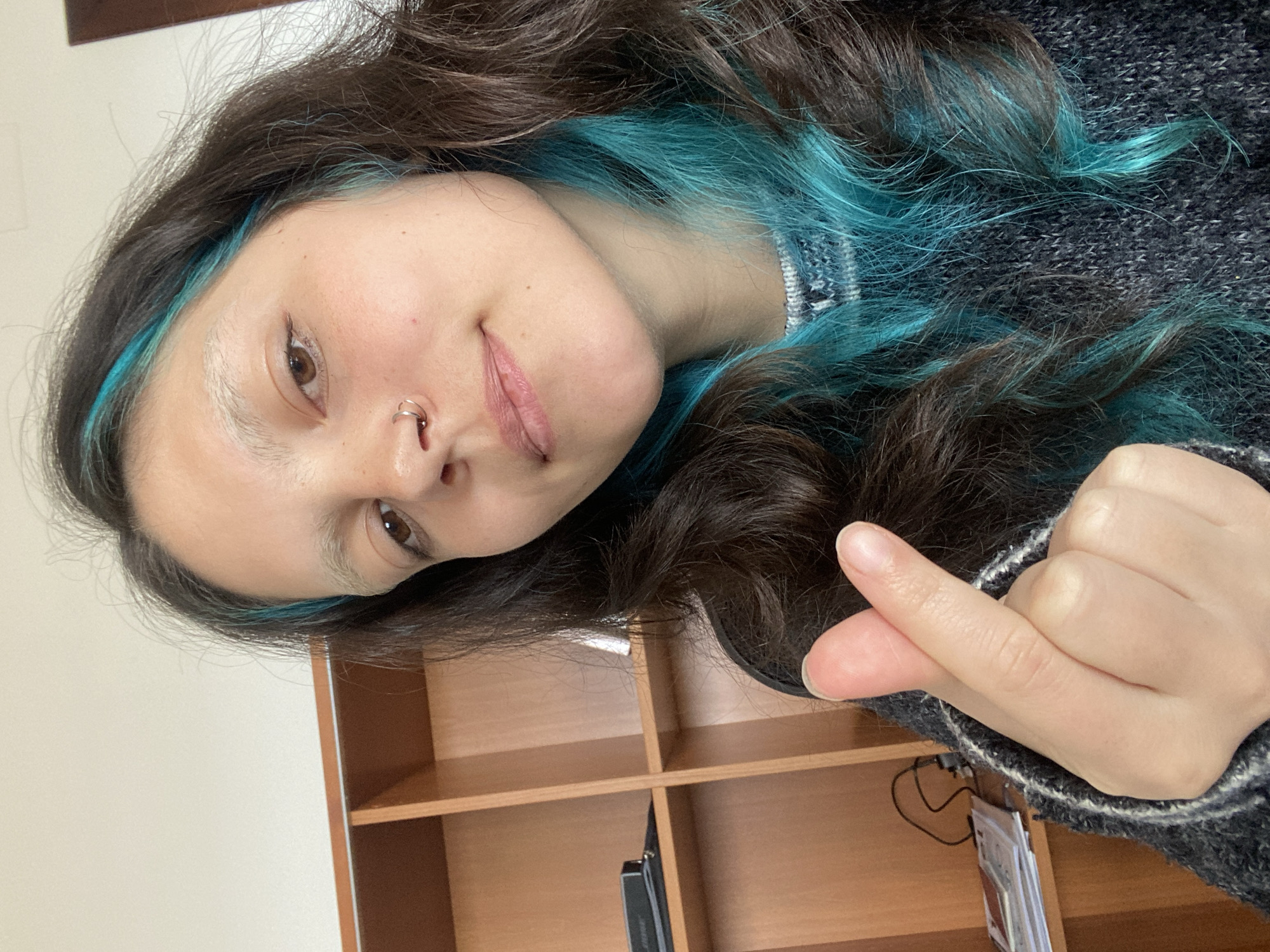 A person with brown hair highlighted with turquoise hues is shown in a close-up, angled shot. The person has fair skin and a piercing in their left nostril. Their expression is a slight, closed-mouth smile. The person's right hand is visible, forming a gesture in front of them. They are wearing a dark-colored sweater. Behind the person, a wooden bookshelf with empty shelves is visible. The location is not discernible from this image, so no indication of being Gijón/Xixón, Spain.