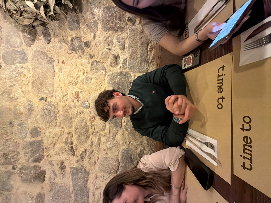 The image depicts an interior scene within a dining establishment in Braga, Portugal. Three individuals are seated at a dark wooden table against a rustic stone wall composed of irregular, light-colored blocks. Dried foliage is affixed to the wall in the upper right quadrant. The central figure is a male with dark, curly hair and stubble, wearing a dark green V-neck sweater over a white collared shirt. He wears a watch on his left wrist, and his hands are clasped on the table. He is looking towards his left (viewer's left) with a slight smile. To the left of the male, a female individual is partially visible. She has light-colored hair and is wearing a light-toned top. Her face is mostly cropped, but a portion of her cheek and chin suggests a smile. Her left arm rests on the table. To the right of the male, a second female individual is partially visible. She has dark hair and wears a light-colored, ribbed top. She is actively engaged with a silver-colored smartphone, holding it in her right hand, which rests on the table. Her head is tilted downwards, focusing on the illuminated screen. A watch or bracelet is visible on her left wrist. The table is set with light brown paper placemats. One placemat has "time to" printed in dark lettering, while another is positioned upside down, displaying "oʇ ǝɯıʇ". Cutlery, including forks and knives, is present on paper sleeves on the placemats. A black rectangular dish or tray is located on the table to the left of the central male. A second smartphone, encased in dark material with an orange sticker, is visible on the table between the male and the right-side female.