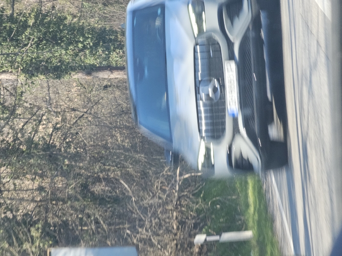 The scene is located in the city of Samovodene, Bulgaria. A light grey Mercedes-Benz SUV or crossover is depicted in motion on a paved road, approaching the viewer. The vehicle displays a prominent front grille with vertical chrome slats and the Mercedes-Benz star emblem. Its headlights, appearing to be LED daytime running lights, are illuminated. A Bulgarian license plate, bearing the registration "CB 9883 PP", is affixed to the front bumper. A single individual, the driver, is faintly discernible behind the windshield, obscured by motion blur. To the immediate left of the road, green grass and a white roadside marker post are visible. The background consists of dense vegetation, featuring numerous bare deciduous tree branches and sections of evergreen foliage, indicating a natural or wooded environment under daylight conditions.