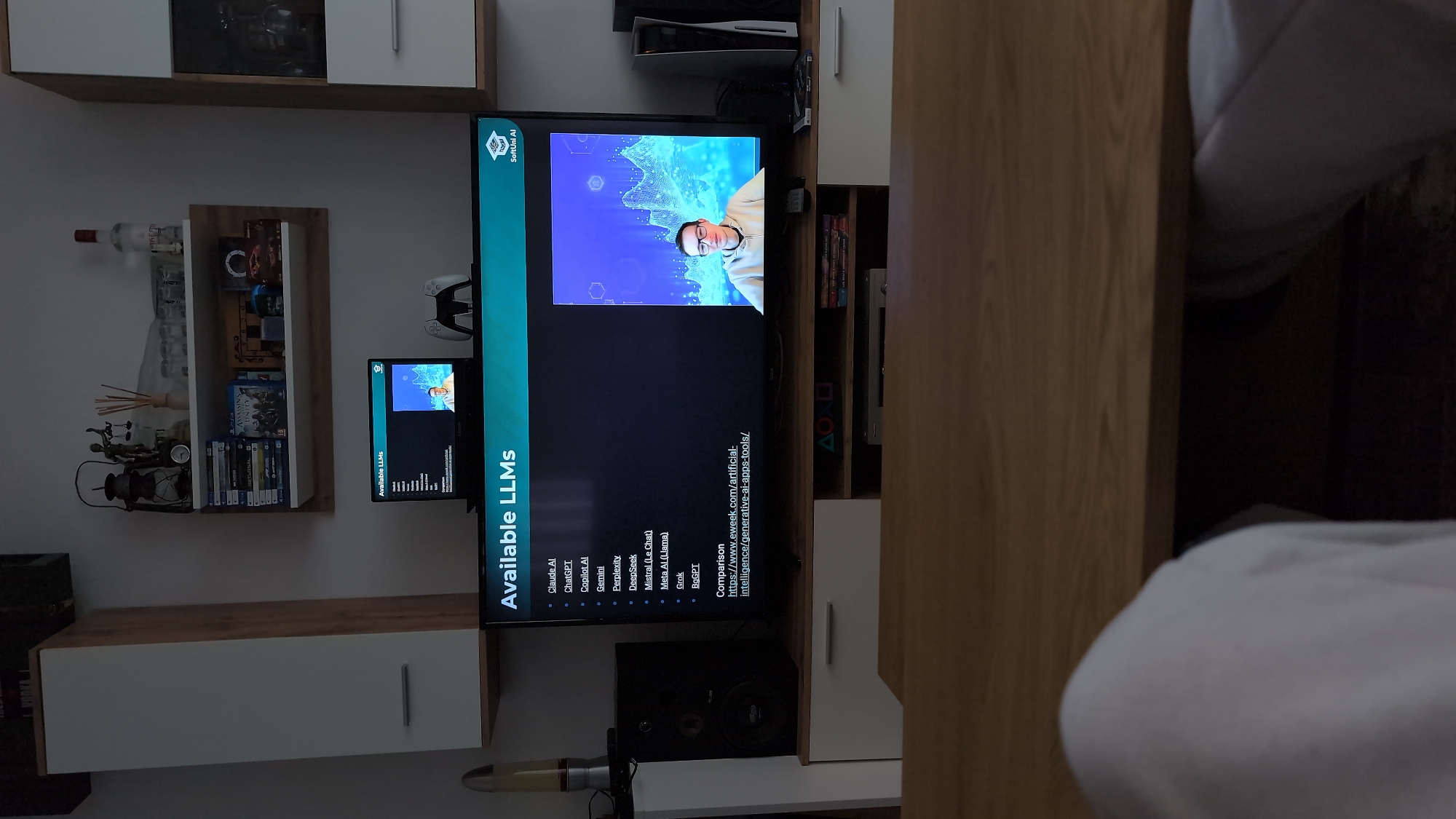 living room interior, likely in a residential setting. A television screen displays the text "Available LLMs," along with a list of various AI language models, including "Claude Al," "ChatGPT," "Copilot Al," "Gemini," "Perplexity," "DeepSeek," "Mistral (Le Chat)," "Meta Al (Llama)," "Grok," and "PiGPT." On the television screen is a thumbnail of a person. The television is placed on a wooden and white storage unit, which also houses a PS5 and what appears to be a speaker. Adjacent to the television, a smaller screen replicates the same information. To the left of the smaller screen, a wall shelf holds various items, including video games (among which "Assassin's Creed Unity" is visible), decorative objects, and bottles. The image is taken from a vantage point near the furniture, with a portion of a person's leg visible in the right foreground. Given the details, there is no specific indication that this is located in the city of Oreshak, Bulgaria, however this can be confirmed using specific elements within the image.