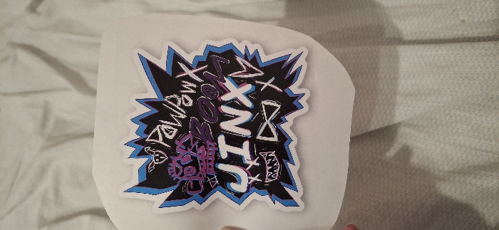 The image displays a single, irregularly shaped sticker with a jagged, explosive-like outline, predominantly black with a blue border