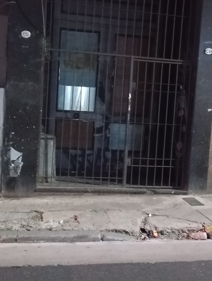A gated doorway of a building is captured at street level. The gate is made of vertical and horizontal metal bars, obscuring the interior. Light shines through a window, revealing a white curtain. Street numbers "1251" and "1249" are visible on the building's facade on either side of the doorway. The sidewalk shows signs of disrepair, with cracks and missing pieces near the curb. The street surface is visible in the foreground.
