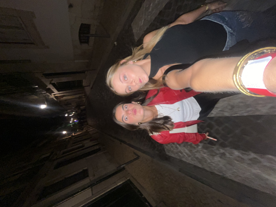 Two young adult females are captured in a nighttime selfie on a narrow, steeply inclined cobblestone street in a historic district of Lisbon, Portugal