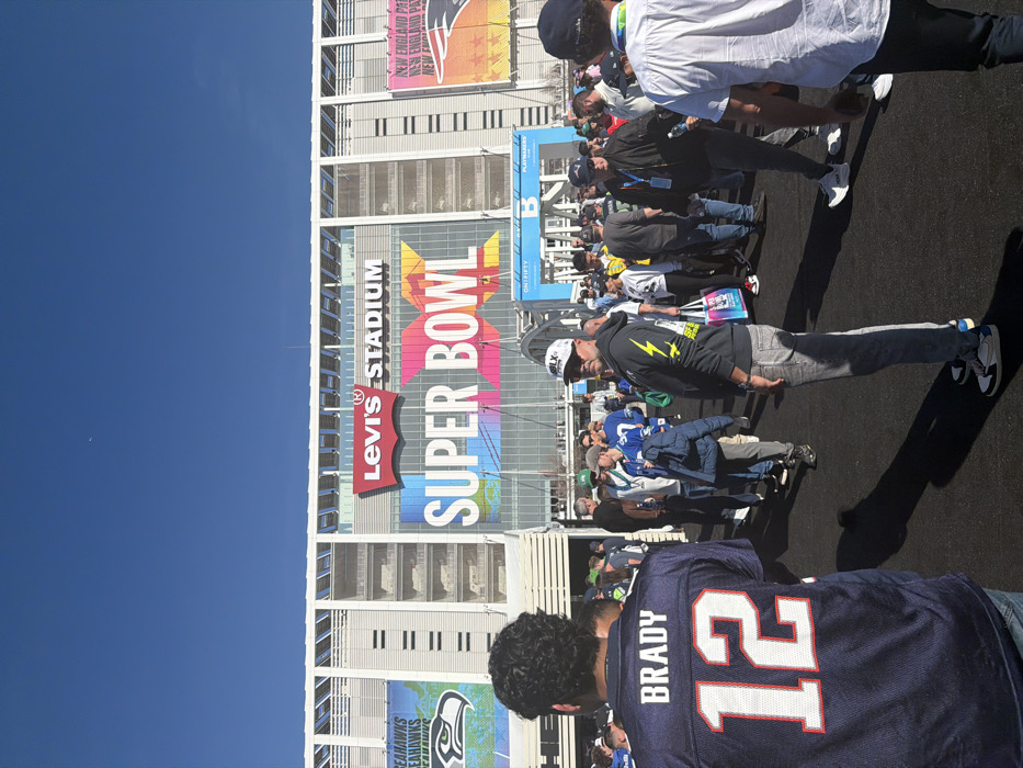 Levi's Stadium is seen with "Super Bowl" displayed prominently on the building's facade. A crowd of people gathers nearby, many wearing sports jerseys. A person in the foreground has a "Brady 12" New England Patriots jersey. Banners for the New England Patriots and the Seattle Seahawks are also visible on the building. The sky is clear and blue.