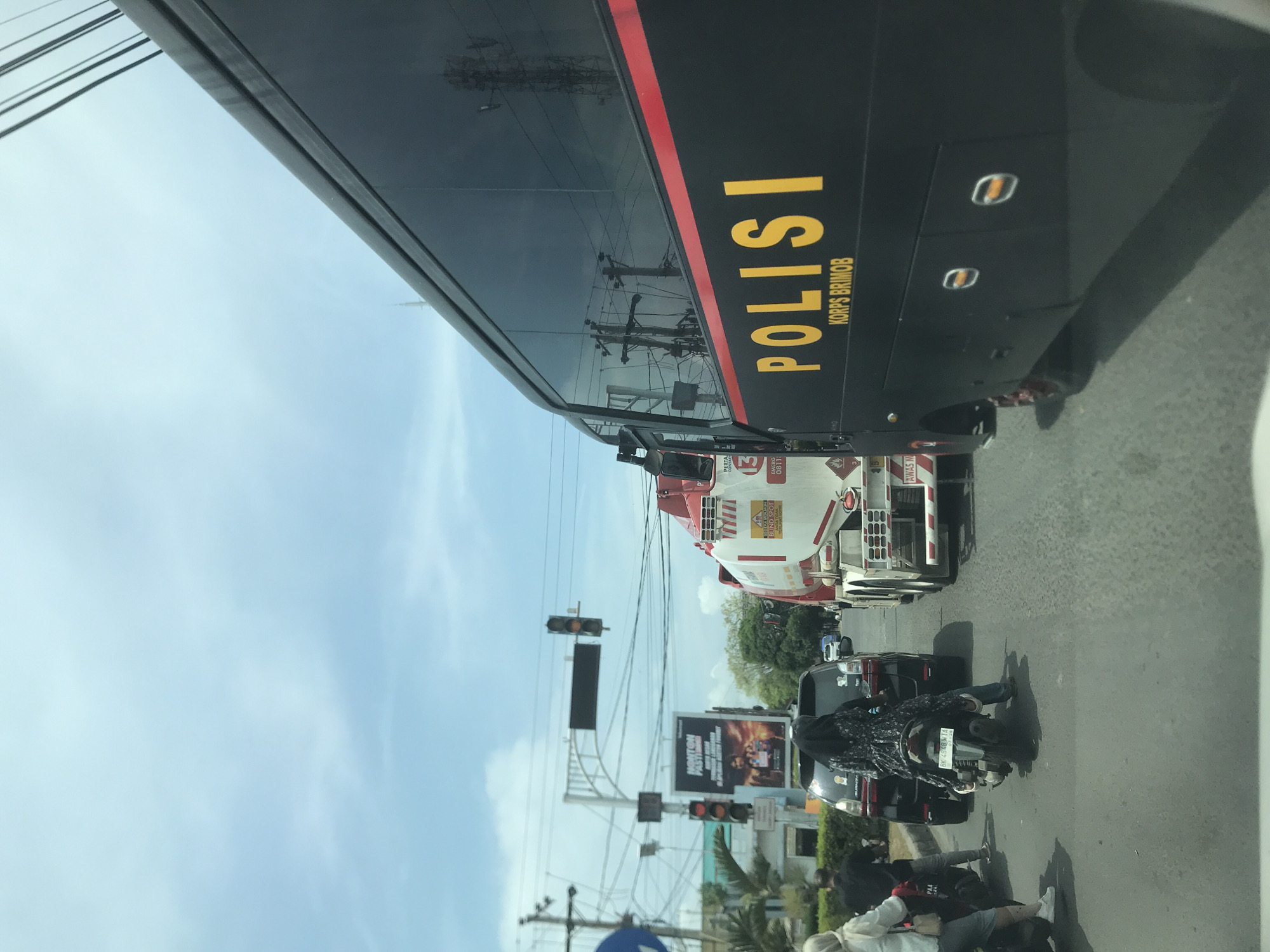 street scene in Lhokseumawe, Indonesia. A "POLISI KORPS BRIMOB" bus, a white and red tanker truck, and a black SUV are in traffic at an intersection with traffic lights. A billboard is visible in the background. Motorcyclists are also in the street, with one motorcycle's license plate reading "BK 4848 WT." Warning labels and numbers are visible on the tanker truck. Overhead power lines are visible. The sky is blue with some clouds.